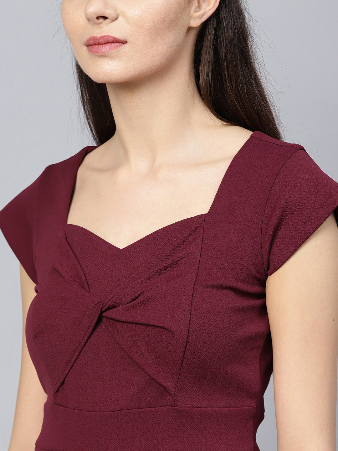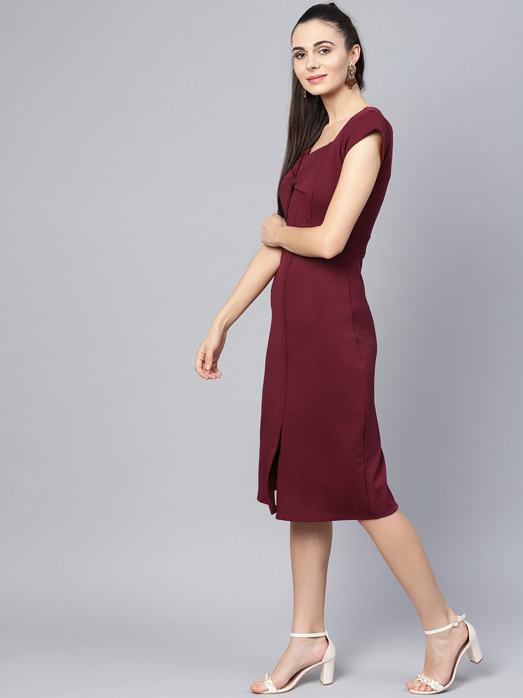 Created with a sense of multi-functionality, this gorgeous Midi Burgundy is perfect for a casual date or small office parties. Highlighted with bow shaped collar and split end this dress brings an edgy look.